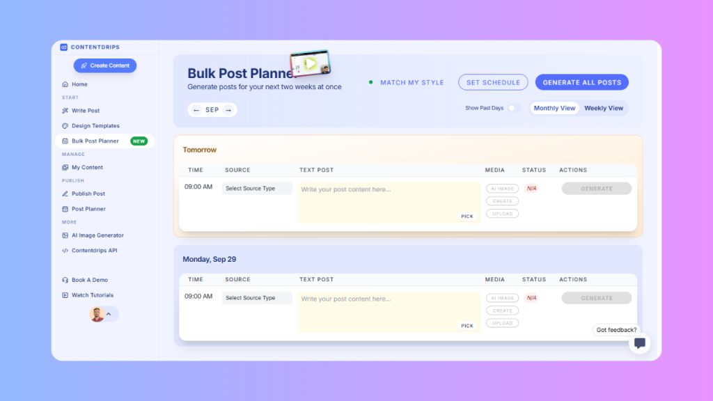 Supercharge your Bulk Post Planner workflow: match your style, generate visuals, and schedule social posts in bulk.