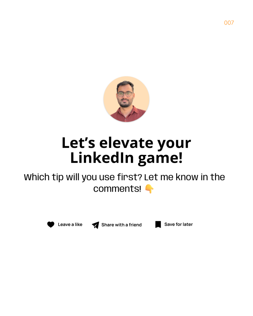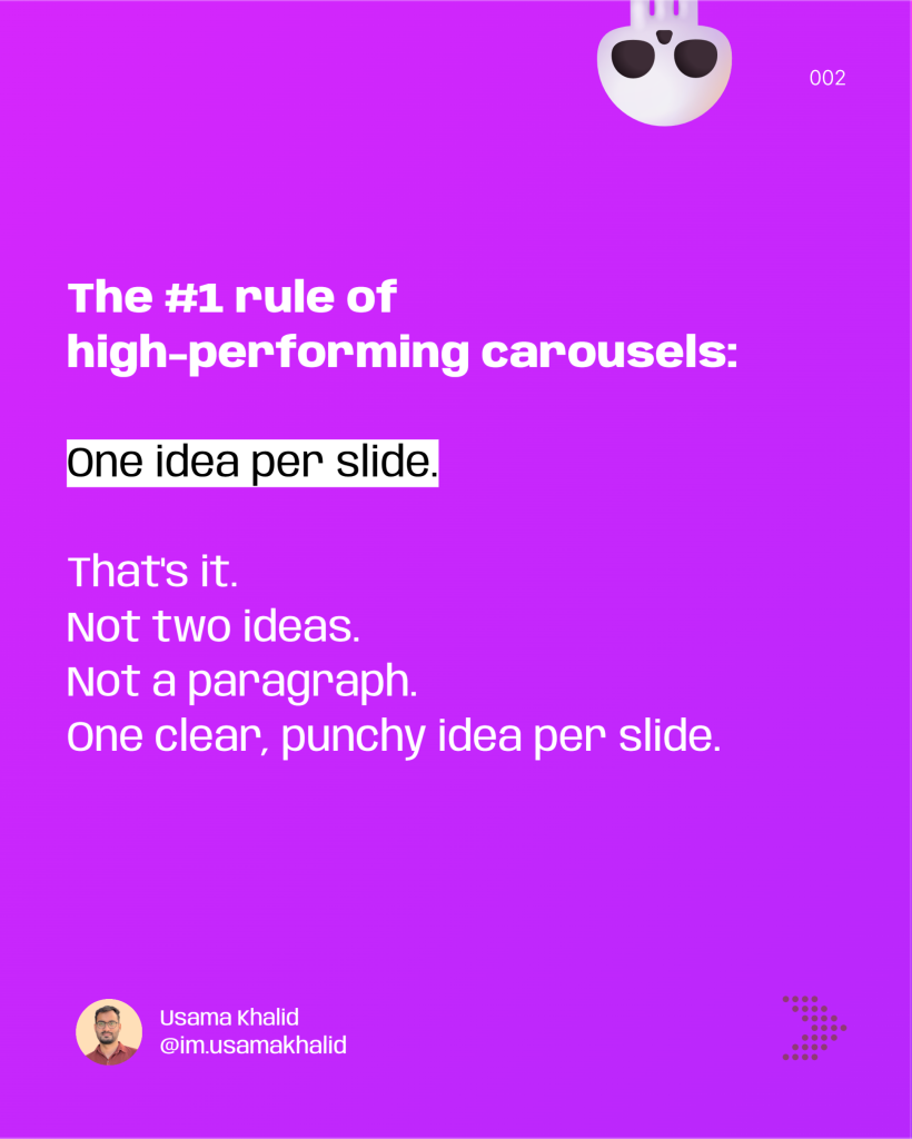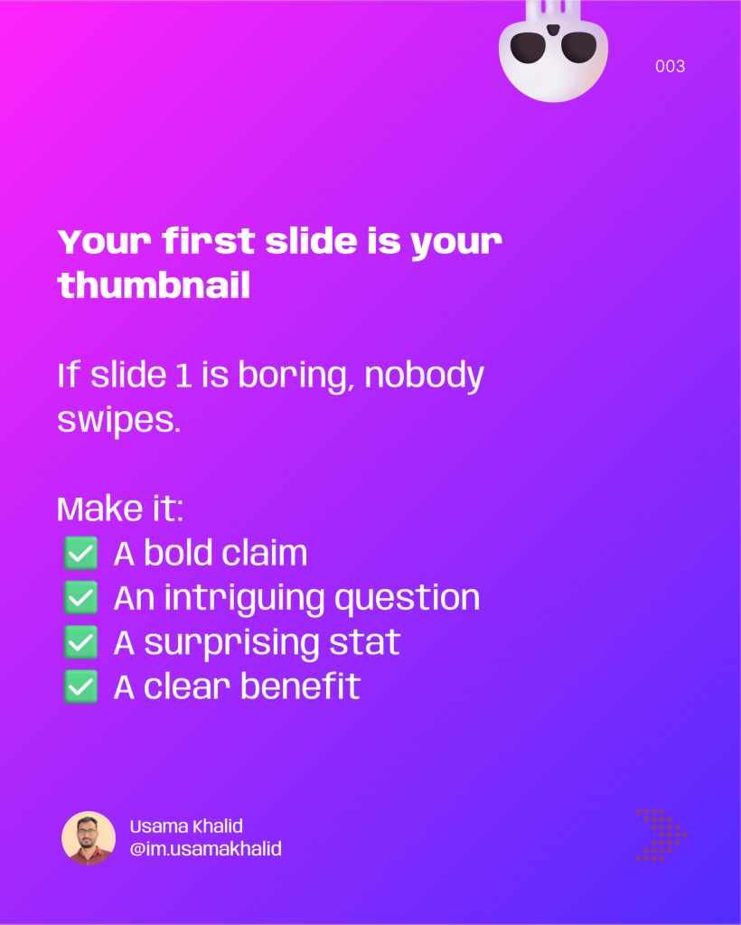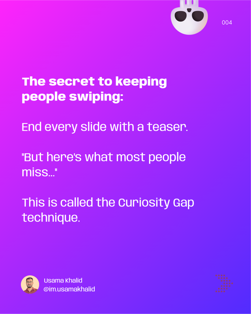End each slide with a teaser for the next one. Example: “But here’s what most people miss…” This increases swipe-through rates.