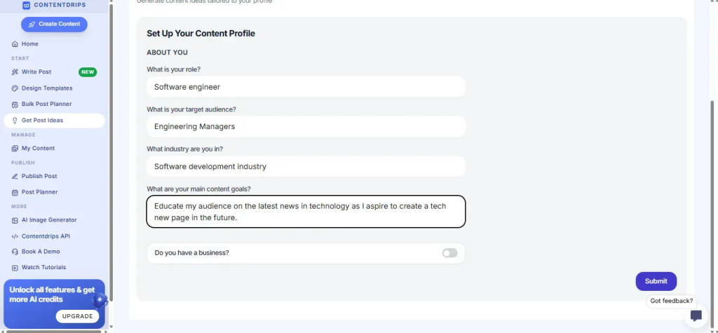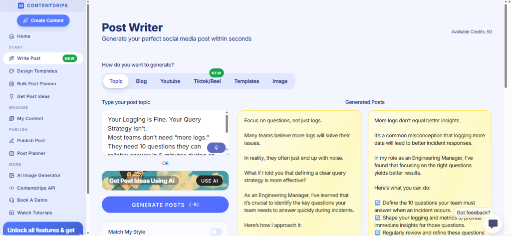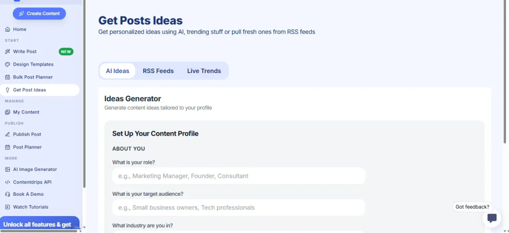 Stop staring at a blank screen wondering what to post. With Contentdrips’ AI Ideas Generator, you’ll get personalized content ideas tailored to your profile, expertise, and audience—no brainstorming required.