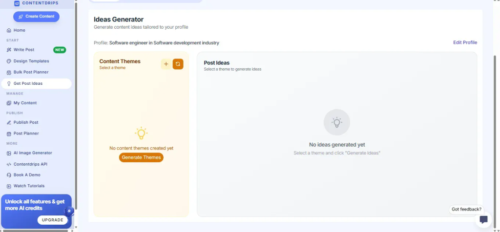 Based on your profile, Contentdrips will create personalized Content Themes—broad topic categories that align with your expertise and audience.