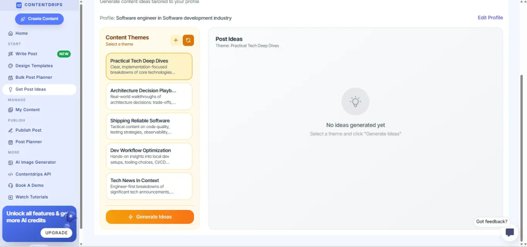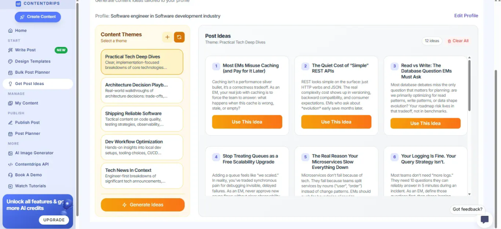 Once you select a theme, Contentdrips generates specific, ready-to-use post ideas within that theme.